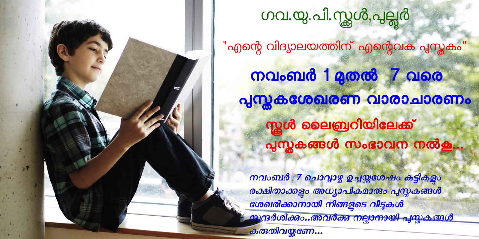പൊതുവിദ്യാലയങ്ങളില് പഠിക്കുന്ന എല്ലാകുട്ടികളെയും മികച്ച വായനക്കാരാക്കി മാറ്റുക എന്ന ലക്ഷ്യത്തോടെ സര്വ്വ ശിക്ഷാ അഭിയാന് നടപ്പാക്കുന്ന 'നല്ല വായന,നല്ല പഠനം, നല്ല ജീവിതം' എന്ന പരിപാടിയുടെ ഭാഗമായി നവംബര് 1 മുതല് 14വരെ സംസ്ഥാനത്തെ എല്ലാ പൊതുവിദ്യാലയങ്ങളിലും പുസ്തക സമാഹരണ യജ്ഞം നടത്തുകയാണ്.ഇതിന്റെ ഭാഗമായി നമ്മുടെ വിദ്യാലയത്തിലും നവംബര് 1 മുതല് 7വരെയുള്ള ഒരാഴ്ചക്കാലം പുസ്തക ശേഖരണവാരാചരണമായി കൊണ്ടാടുകയാണ്.ഈ ദിവസങ്ങളില് പൂര്വ്വ വിദ്യാര്ത്ഥികള്ക്കും,രക്ഷിതാക്കള്ക്കും നാട്ടുകാര്ക്കും,ഈ വിദ്യാലയത്തെ സ്നേഹിക്കുന്ന മറ്റുള്ളവര്ക്കും വിദ്യാലയത്തിലെ ലൈബ്രറിയിലേക്ക് പുസ്തകങ്ങള് സംഭാവന നല്കാം.